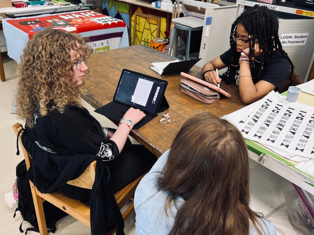 The planning began in the Spring of 2025 with October 12, 2025, as the official event date. High school art students designed and carved the majority of the 3/4 inch wood panels. The carving process took over 100+ hours between both schools. For most students, they had experience with the reduction relief cut method and were familiar with the printmaking process. It is essential to provide students with varied art experiences that continue to shape their appreciation, understanding, and engagement for the creative process and collaboration.