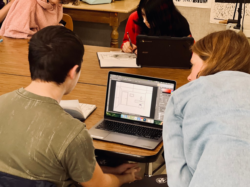 Feature image: designer and artist, Jordan Gottsacker, visits the advanced art class for a critique.