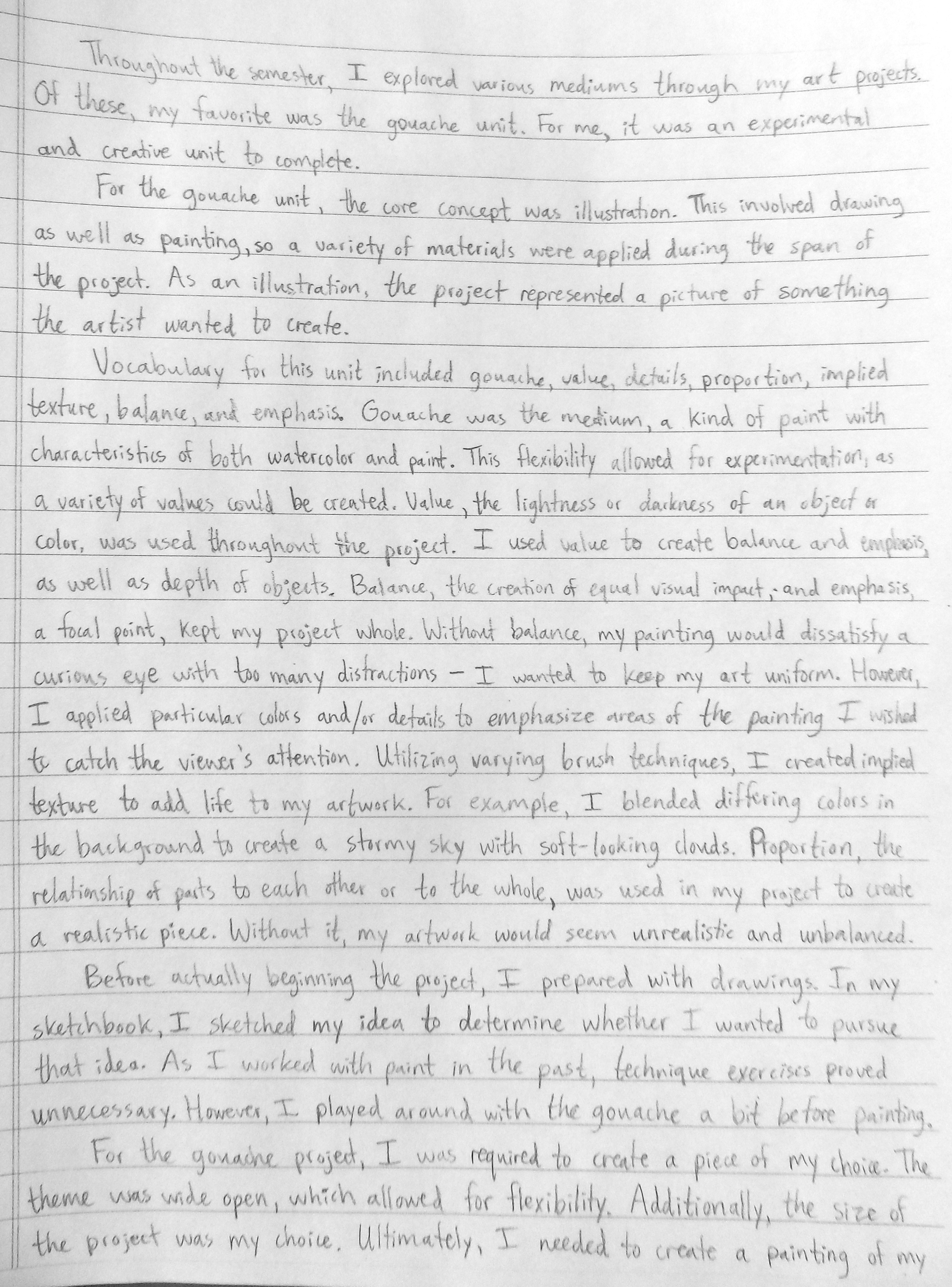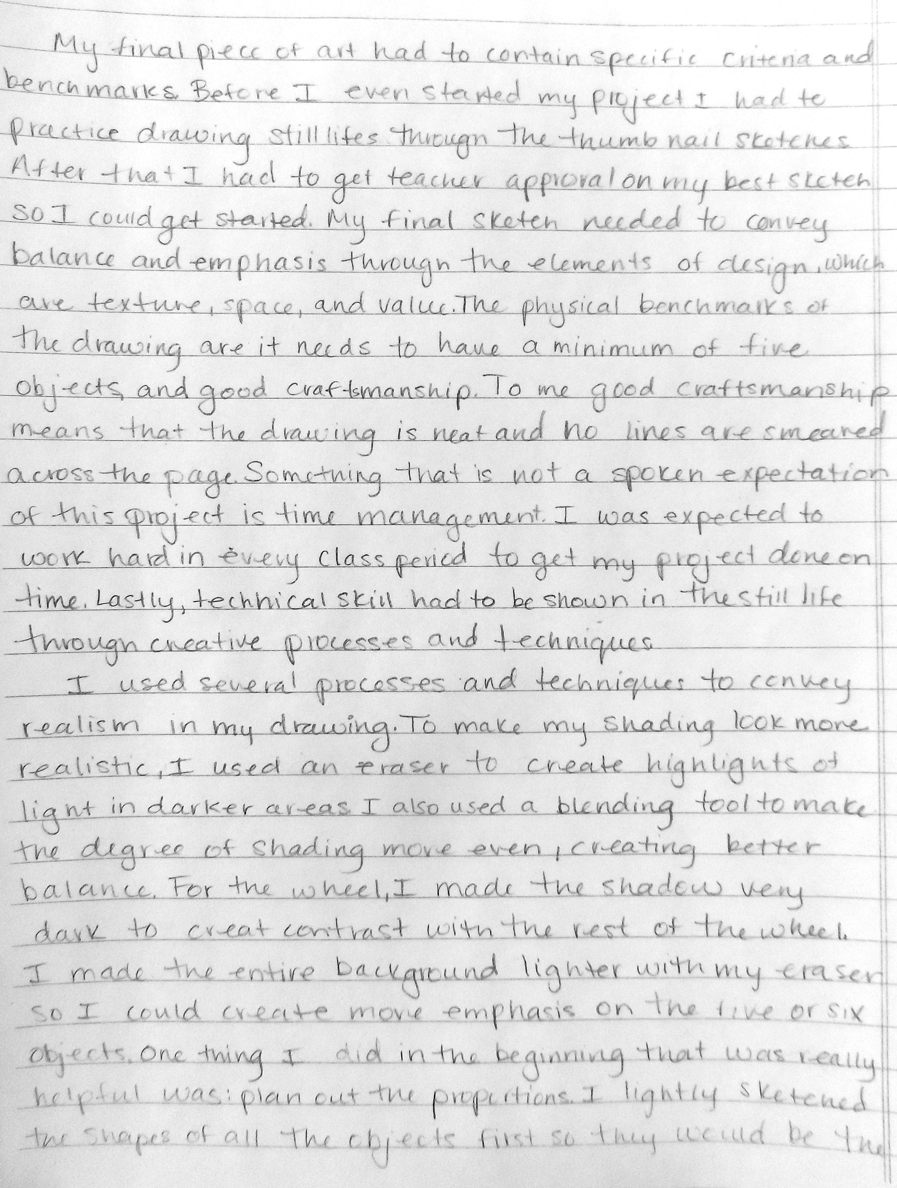 For the past three years, the North High Art Department felt in order for us to get a true assessment on student learning we administered a written final examination. Below is an excerpt along with 2 well-written essays.