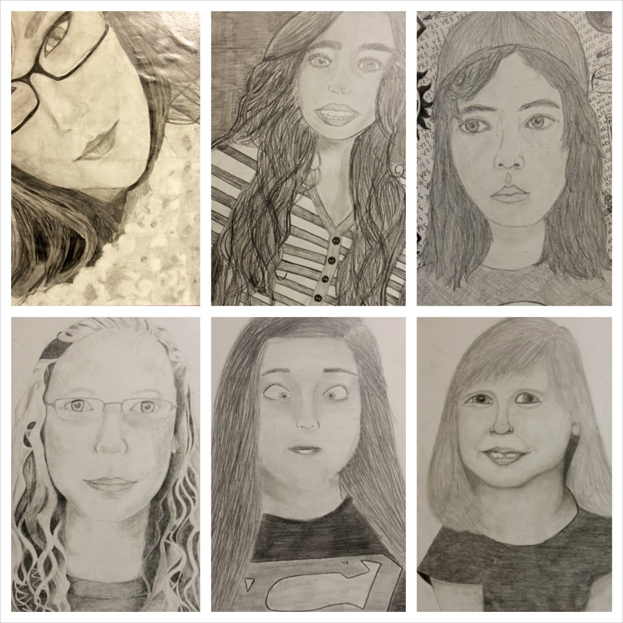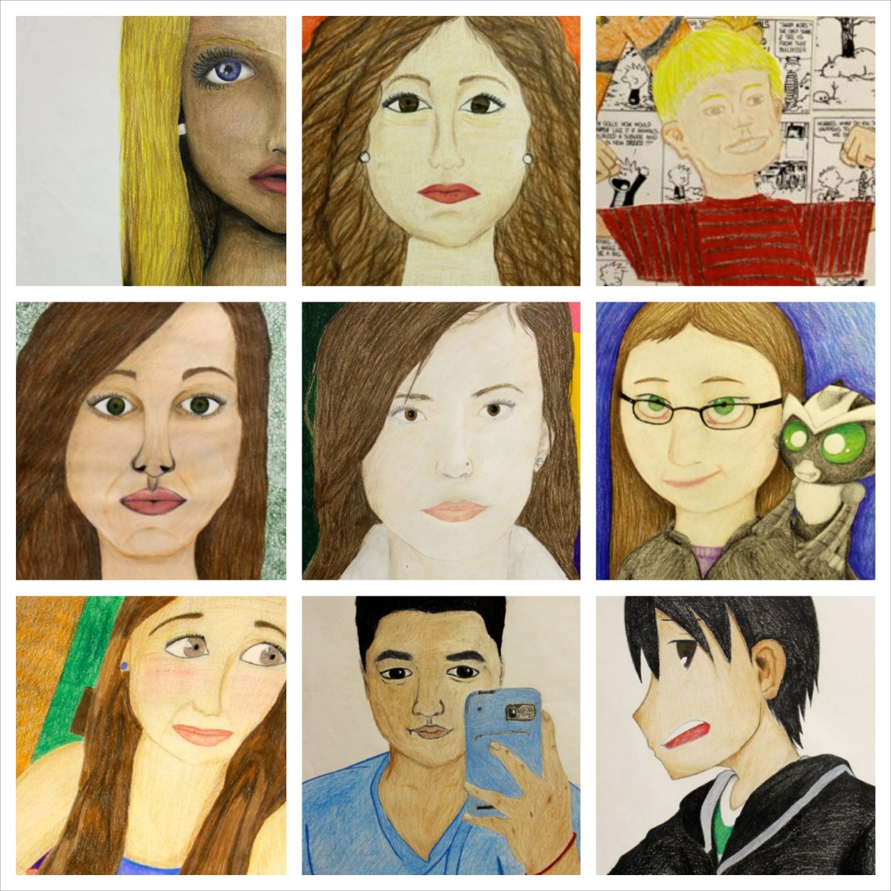Over the past 3 weeks, Art Foundations 1 and 3 students were given the task to compose a ‘selfie’ shot via their digital camera, social media, personal archives or mobile phone. Once they selected their chosen image, they were to create a large scale self-portrait using pencil and color pencil, respectively. Students had the option to free hand the drawing or use a grid. Self-portrait had to incorporate use of details, value, implied texture, color, balance, and emphasis.
