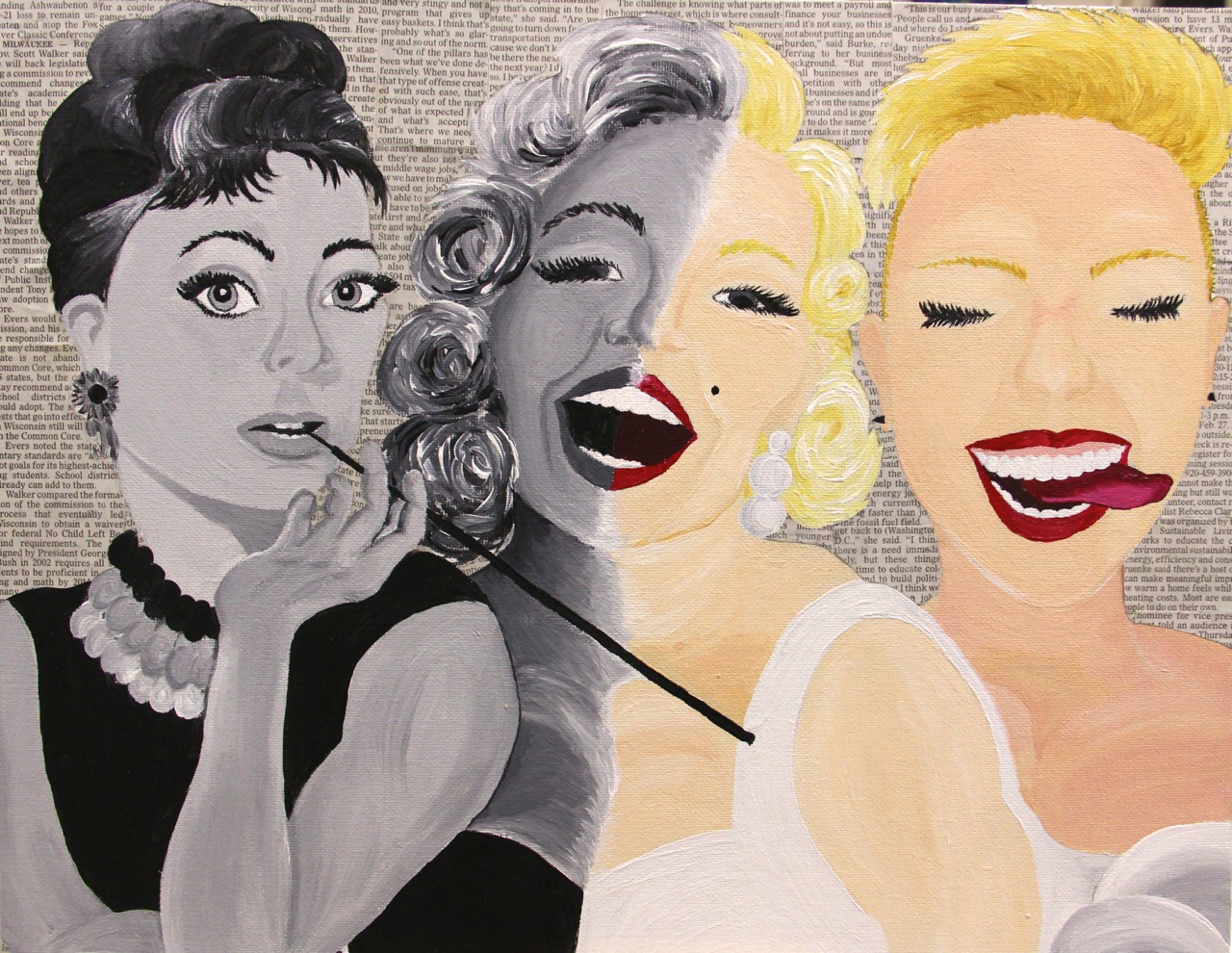 I call this work “Classy to Trashy” because it depicts through famous women icons how women who are in the limelight carry themselves. Women in pop culture have different pressures to make a statement with their looks, actions, and personalities. Over the past six decades there has been an drastic change in the way women portray themselves, especially how they express their sexuality. Audrey Hepburn was a respected, thriving female actress who worked hard for her spotlight and arose as a leading female actor in a male dominant career. Marilyn Monroe emerged into the spotlight from her career in modeling and acting to become America’s major sex symbol. She showed off her curves and promiscuity by becoming an example for women to push the boundaries of looking different than the simple housewife and allowing them to being to express themselves. Miley Cyrus is an ever-changing pop culture icon who loves to put herself out for the world to see whether people appreciate her talents or not. Miley, undoubtedly, had made an impact in today’s society. Her music, clothing, and actions all reflect her promiscuity yet her fans love the way she is a perfect example of being yourself and not caring if anyone were to judge you. Out of the millions of iconic women I believe these three have the perfect balance of complimenting and contrasting each other.
