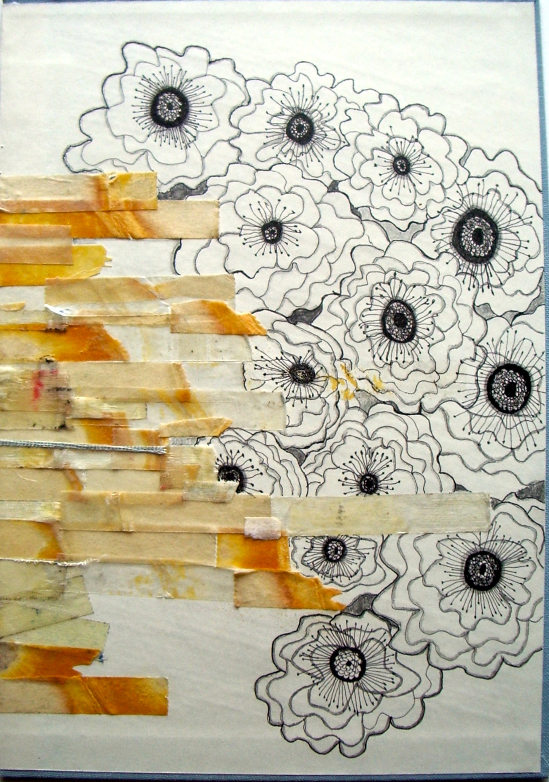 Mel also spent some time in the IMC, where Ms. Gloede so generously invited her to take some of the discarded books from the library. She says she had a wonderful time looking through all the books, and took some for future projects! One of the pieces that she created includes some old cellophane tape that had yellowed, and she used that as the foundation for this piece. There is beauty in the mundane!