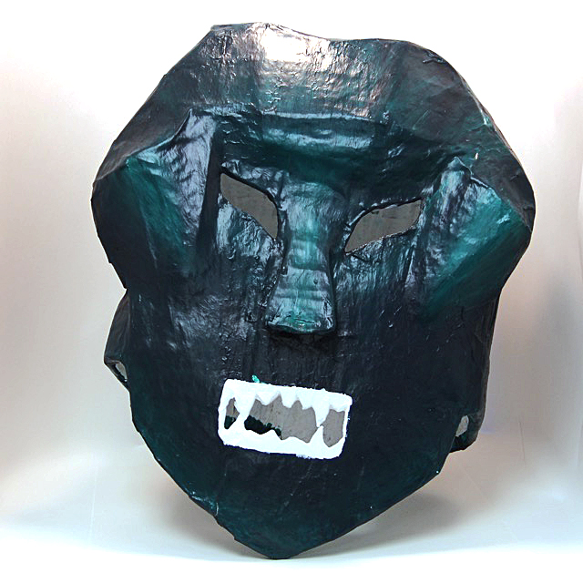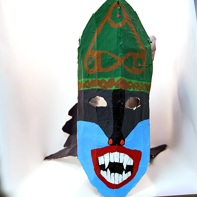 My mask doesn’t really represent anything all that much. I made it look like a cat with an underbite, but gave it green markings. The green markings at not natural in actual cats, but are very noticeable on the darker blue-grey color. I made the mask so I could wear it only on my face, and have my real hair hanging over the top of the mask, the mask is held in place by the hair band and by tucking the sides of it under the sweaters hood. The eyes are not see through as I used a fabric that can only be seen through if your eyes are very close to it. There might actually be a deeper meaning behind the mask but I can’t figure out what it might be or how to put it into words.