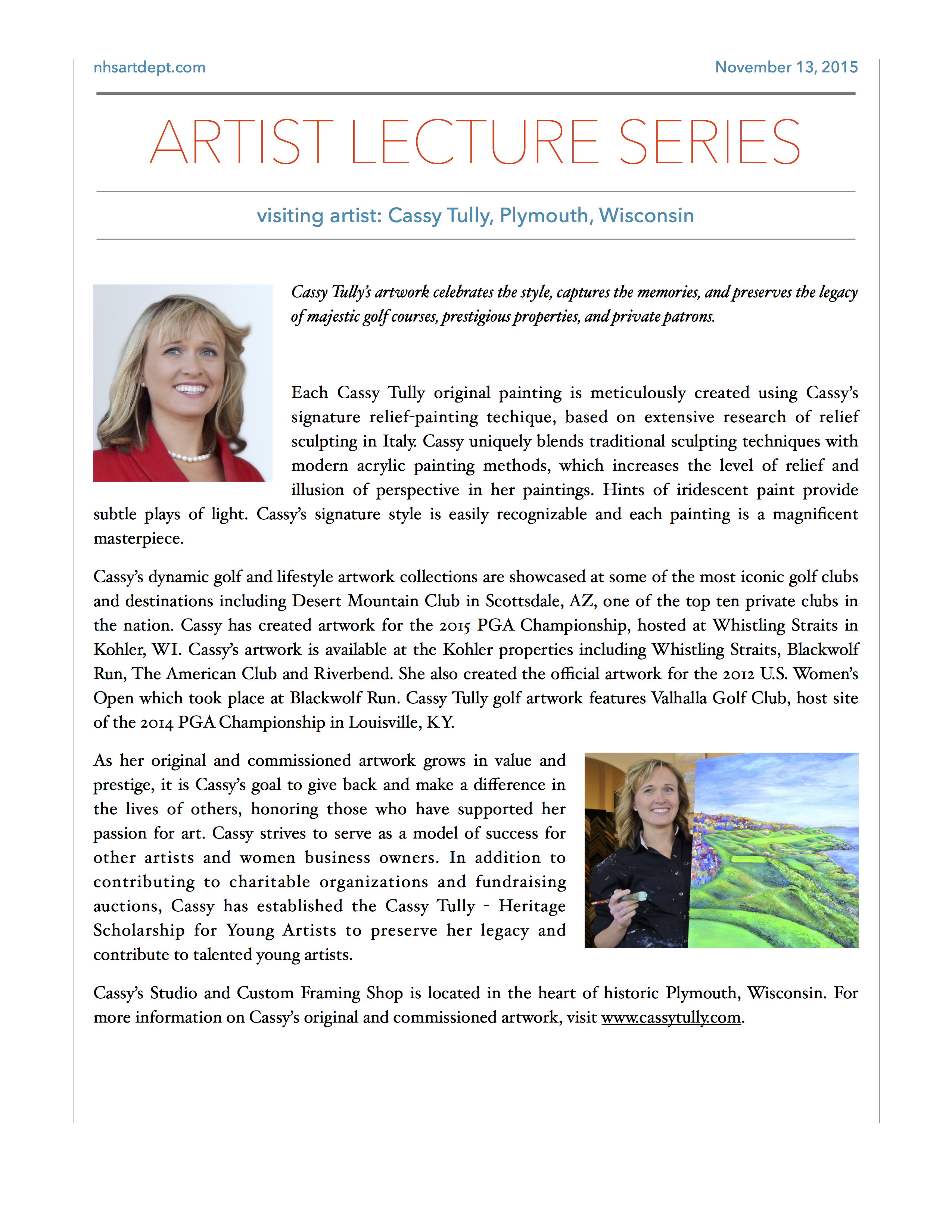 Artist Cassy Tully visits Sheboygan North High School for Artist Lecture Series October 19, 2015 Share this: Click to share on Facebook (Opens in new window) Facebook Click to share on X (Opens in new window) X Like Loading... Related