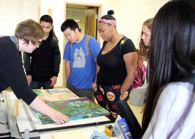 IMG_9931 Previous Next Published October 29, 2015 at 640 × 457 in Drawing Painting I students visit Liz, artist in residence at North High