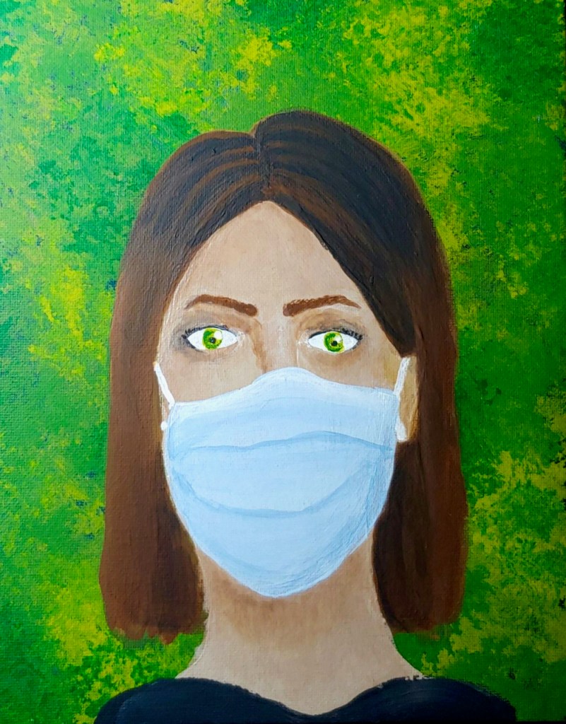 This is an 8 x 10 inch painting that focuses on a girl. She is all alone and wearing a mask. She is surrounded by different shades of green, which symbolizes germs all around her. She looks a little emotionless or overwhelmed with everything going on in our world today. The point of this painting is to show how important it is to wear a mask and stay safe.