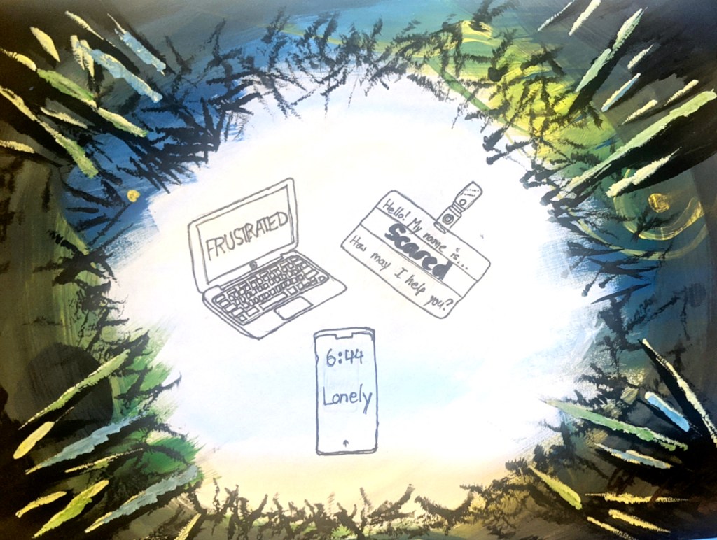 The intent of my artwork was to show negative emotions of the whole covid-19 situation. I wanted to symbolically put objects to represent parts of our lives where we are losing. I put in adjectives for each object to show emotions. Finally, I rarely get migraines, but when I do, there are lots of fuzzy, and flashy colors in all peripheral vision. I tried to represent that on the edges of the piece. I did that because when I get these migraines, it gives me an intense headache, like the virus. I get blind spots wherever I look, hence why I called it, Losing Vision.