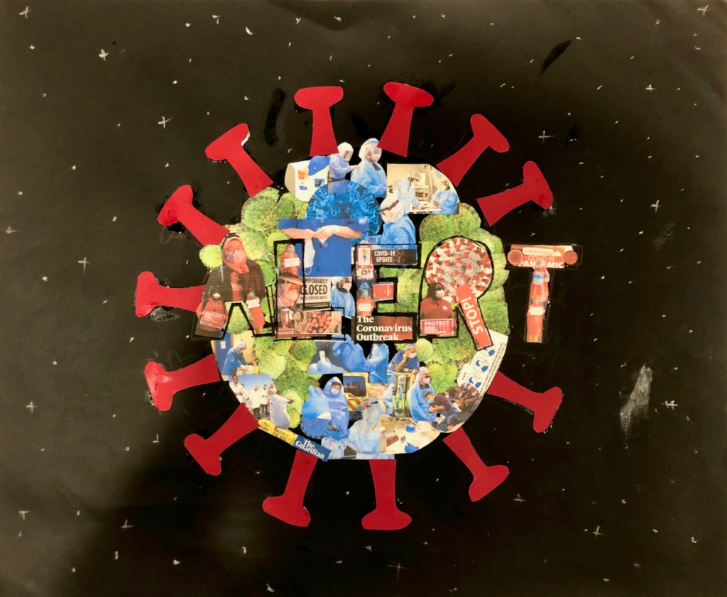 In my art piece, I wanted to try to show how the whole world is struggling with the coronavirus. I made a collage of pictures of the Earth. All the pictures are news articles from all over the world. The Earth is also representing the shape of the coronavirus. The “land” is made up of the coronavirus showing every continent has it. The water and the Alert are made up of photos from different news stories. It also shows how so many healthcare workers are risking their lives by helping people.