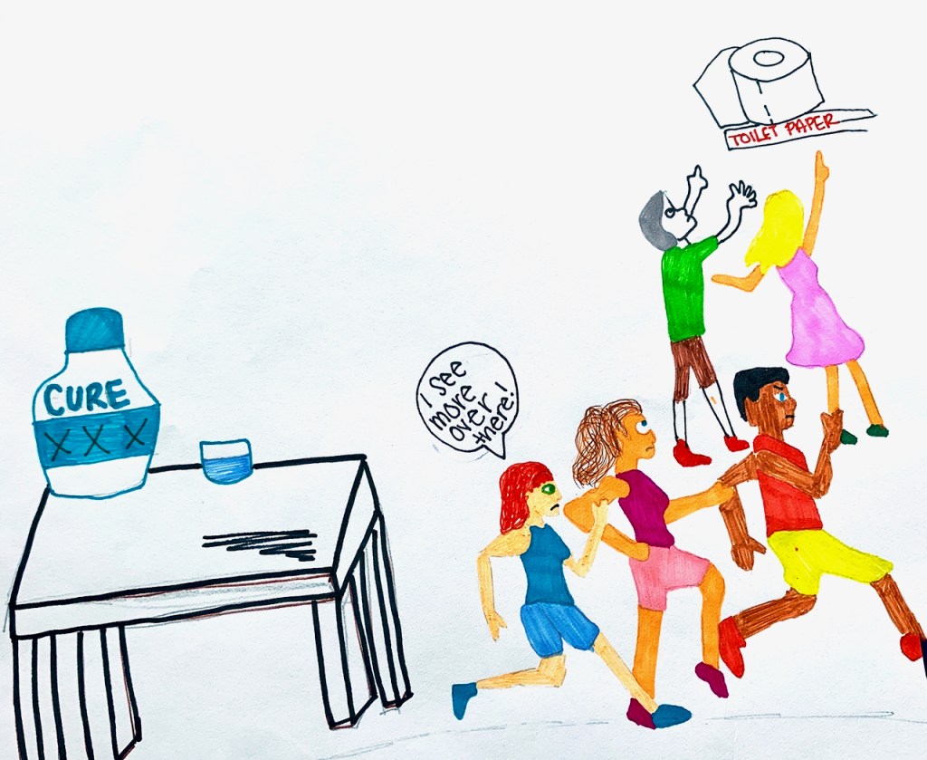 I created a cartoon drawing of people hurrying to get toilet paper instead of looking for the cure. It communicates our society’s messed up priorities.