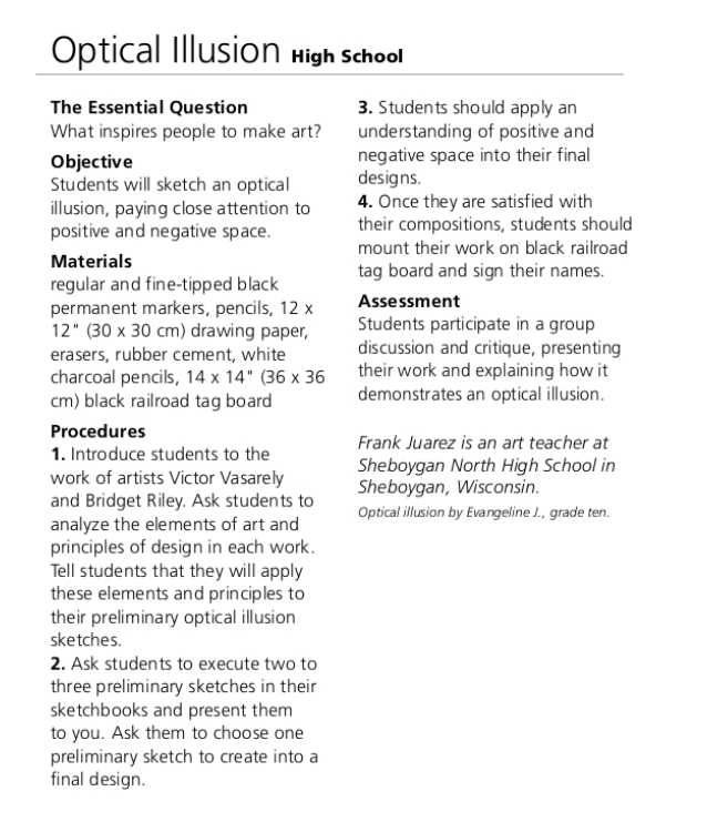 We are thrilled to announce that art student, Evangeline J’s Op Art drawing is featured as one of this issue’s Clip Cards.