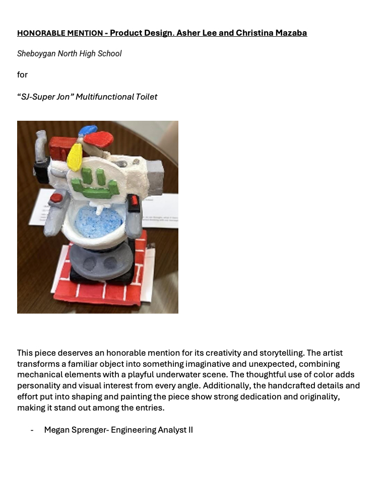 A special personal recognition to Chloe Rohde from Sheboygan North High School. While her project did not receive an award, it powerfully reminded us that disabilities do not always appear as we expect. Some disabilities, such as light sensitivity, are not visible, yet they are very real. As designers—and as people—it is essential that we notice, respect, and design with this understanding in mind. Thank you, Chloe, for sharing this important perspective.