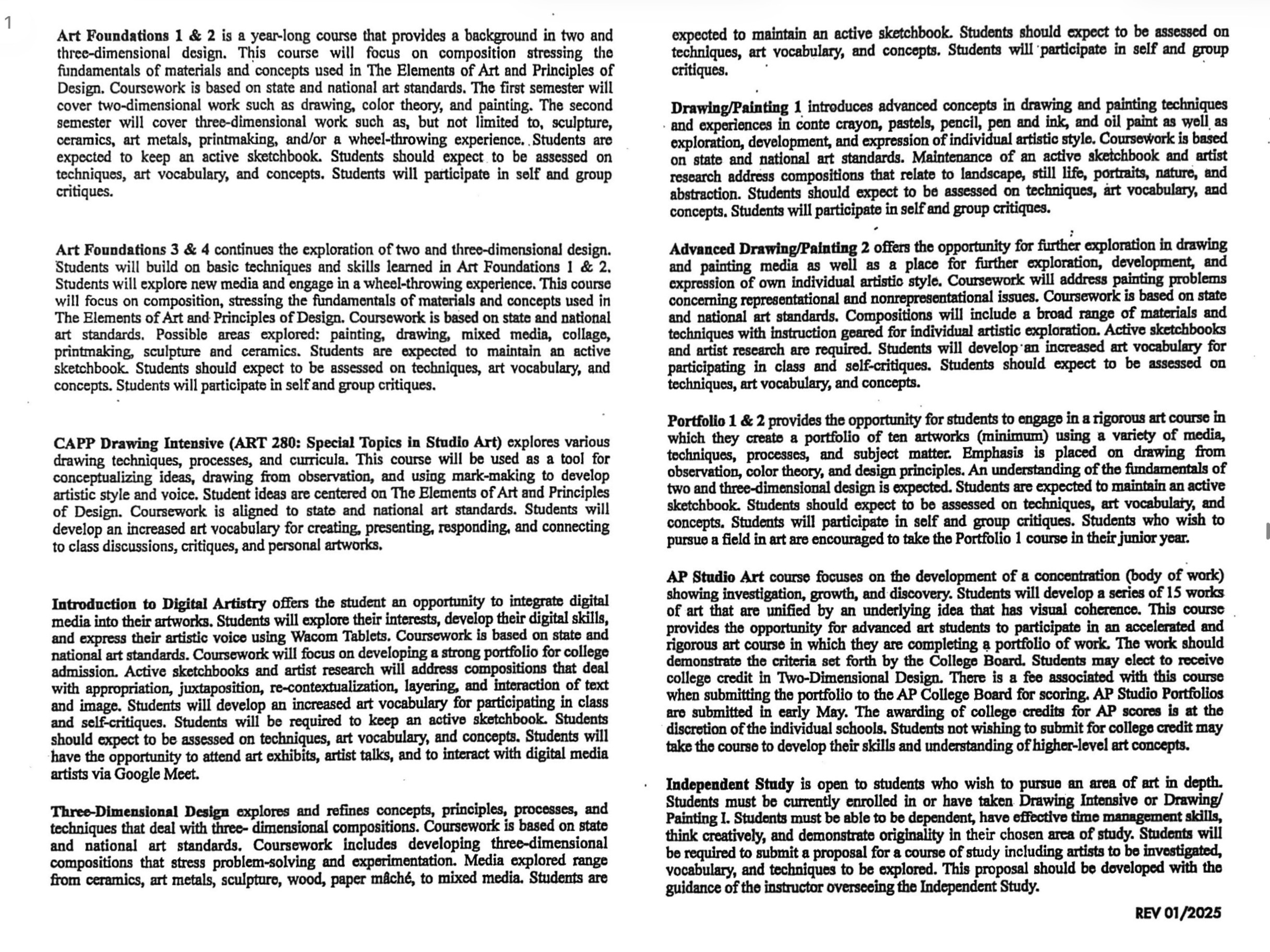 ART COURSES This section contains listing of projects, PowerPoints, lecture notes, reflections and assessments. Courses will have tabs for each art course that Mr. Juárez and Mrs. Arneson are teaching. Share this: Share on Facebook (Opens in new window) Facebook Share on X (Opens in new window) X Like Loading...