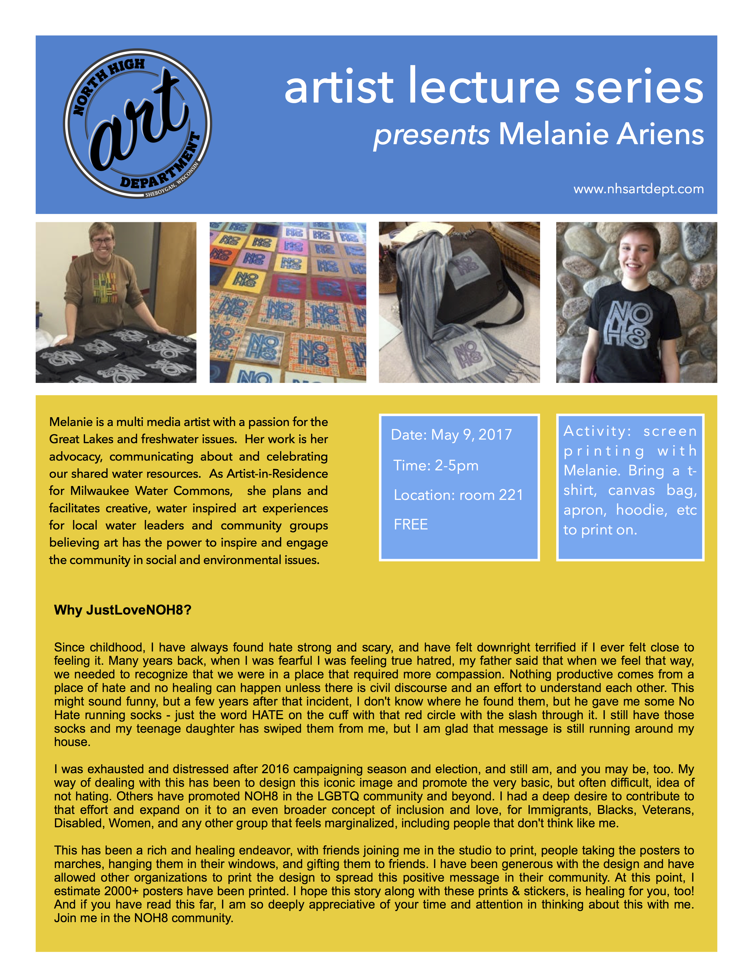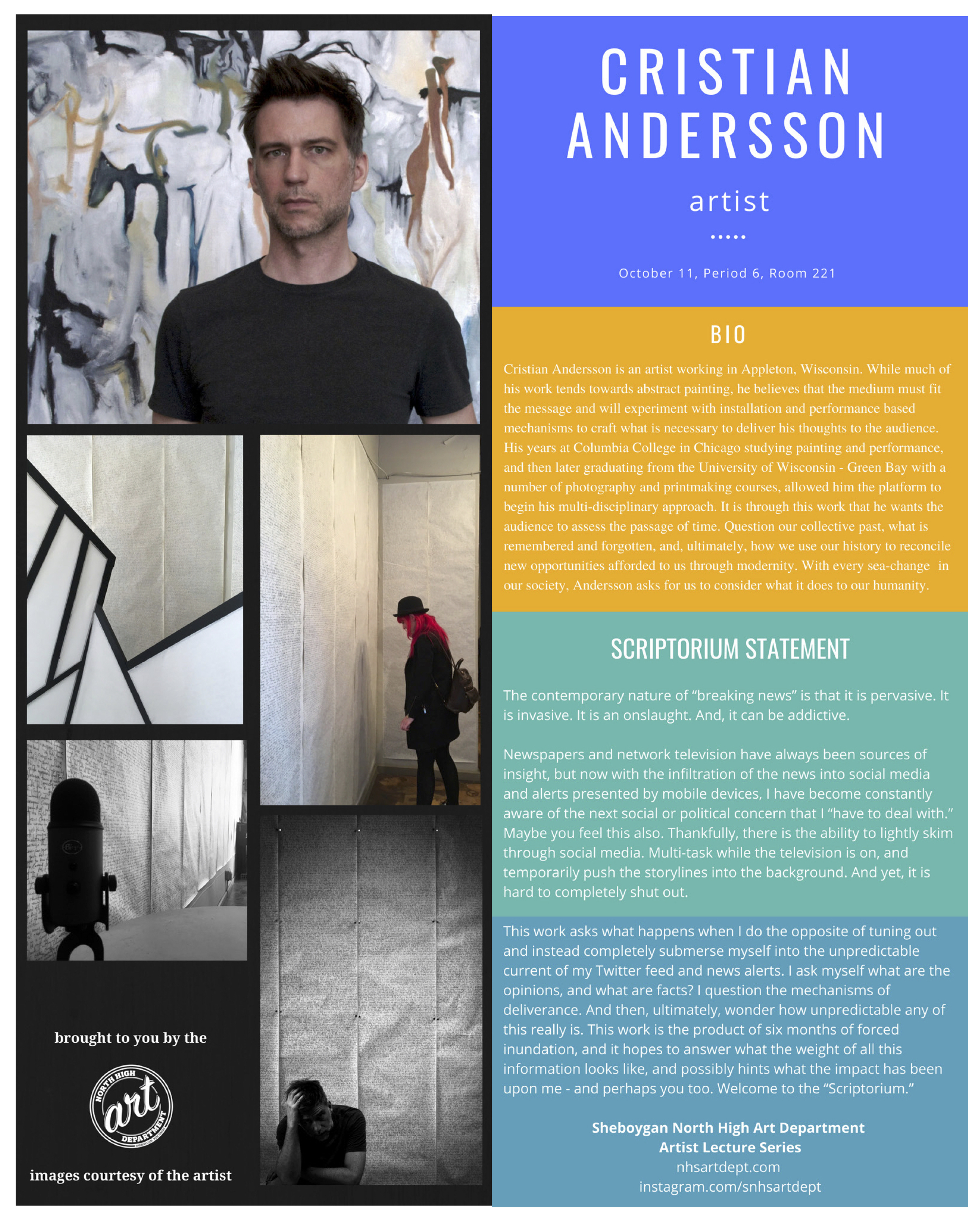 The Sheboygan North High Artist Lecture Series (est. 2010) is an in-school program at Sheboygan North High School. We invite local and regional visual artists to share their journey as artists with the beginning, intermediate, and advanced art classes. Visiting artists present and introduce art students to such as but not limited to: how to present a portfolio, share a body of work, facilitate an art demonstration, or talk about about their artistic journey. This provides our students the opportunity to interact with the artists.